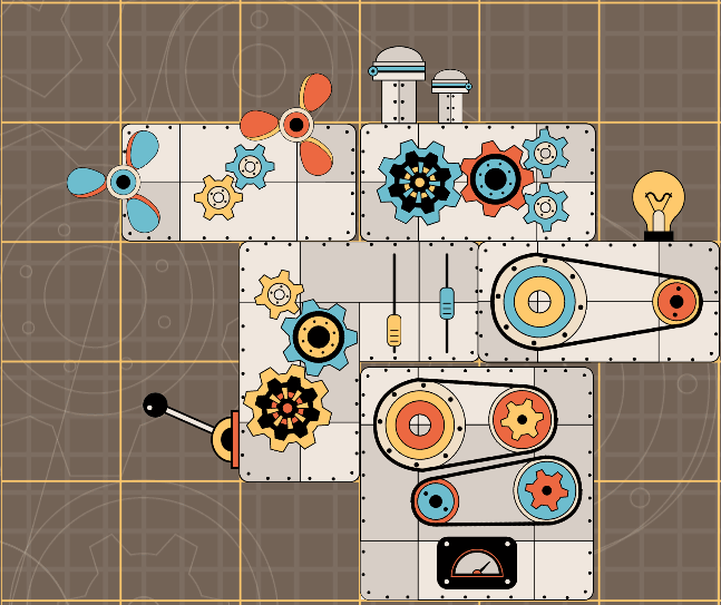 I worked on my dearly beloved Adobe Illustrator. After making assets, I had to assemble every elements with some logic. For instance, I only use chimneys on “engine parts” or fans in “art parts”. This was very time consuming due to the amount of parts I had to manage. I realised at this point the scale of my game was too big, but I couldn’t go back. Some things will have to be cut.
